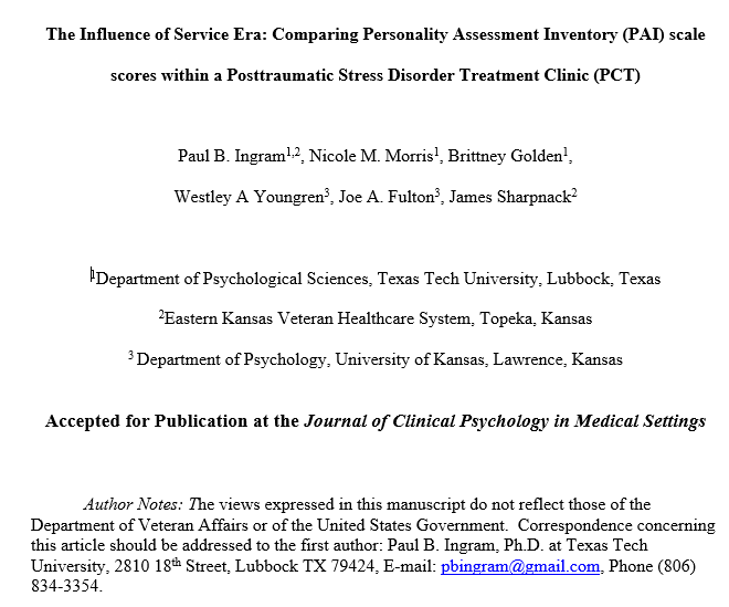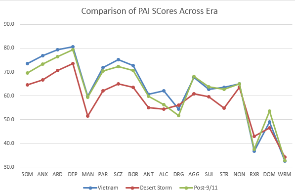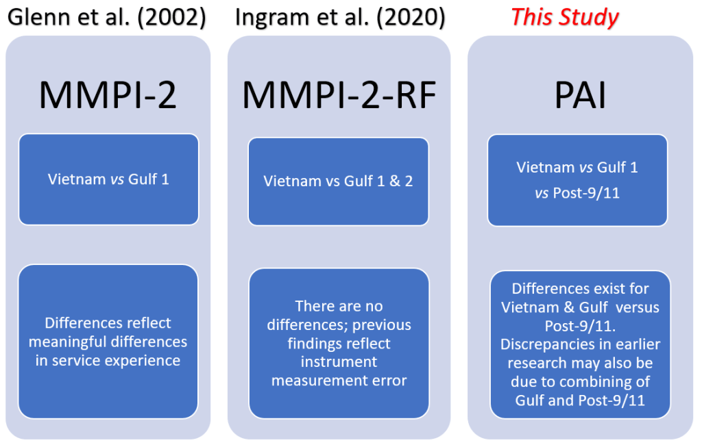 They have also only focused on the MMPI (2/2-RF). While popular, the PAI is equally widely used (Ingram et al., in press; Wright et al., 2017) and doesn’t have the same problem of scale version revisions as a potential explanation for findings (see Ingram et al, 2020) So what did we do about this shortage in the literature? We sampled Veterans from PTSD Treatment Teams (PCTs) and compared Vets from all three eras (Vietnam, Gulf, and Post-9/11) on the PAI, after controlling for Gender and Combat Exposure Severity. And what did we find?