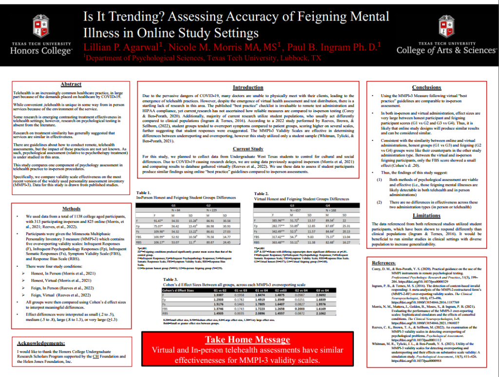 One of my fantastic undergraduates conducted a study using existing MMPI-3 study data (Morris et al., 2021; Reeves et al., 2022) to compare the effectiveness of the over-reporting scales across in person and virtual administrations. Given the guidelines put out about telehealth assessment (Corey & Ben-Porath, 2020) and the expanding research on general comparative effects of virtual psychological interventions, we expected that the scales would perform equally. Indeed, that was what we found. One implication of our findings is that future meta-analyses of the MMPI-3 validity scales will likely not need to consider this element of study design as a potential moderator for scale effectiveness.