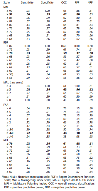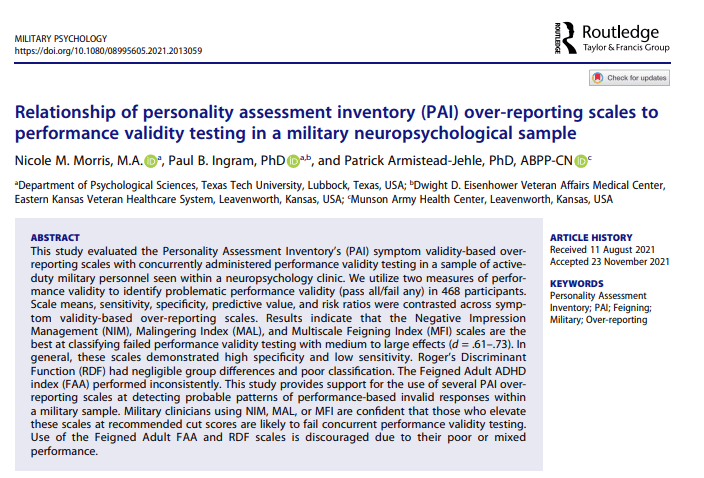 Nicole did some excellent work to build on the limited literature on PAI validity scales, evaluating their effectiveness in a military sample evaluated within a neuropsychology clinic. We used performance validity (PVT; MSVT, NVMSVT) to compare group differences. Limited work has been done prior to now on some of the PAI validity scales (see McCredie & Morey, 2018), so expanding this literature for one of the most popular and widely used personality measures (Ingram et al., 2019, 2022; Mihura et al., 2017; Wright et al., 2017) is critical. I’ve reproduced the classification accuracy statistics below for ease. The entire paper may be downloaded HERE.
