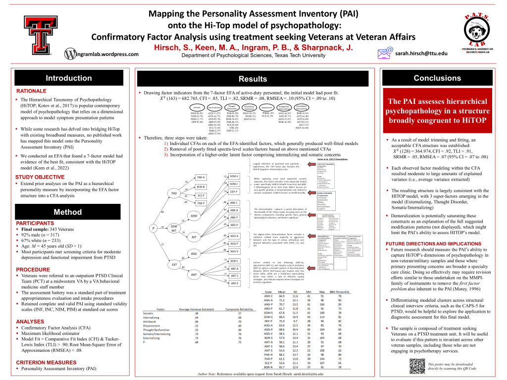 I’m excited to head to my first APS conference to present some recent work by Sarah Hirsch and Megan Keen on the Personality Assessment Inventory (PAI) and efforts to map HiTop onto this instrument. We focused on military populations and used an EFA/CFA approach on distinct samples but examine how (and how well) these efforts apply to military service members.