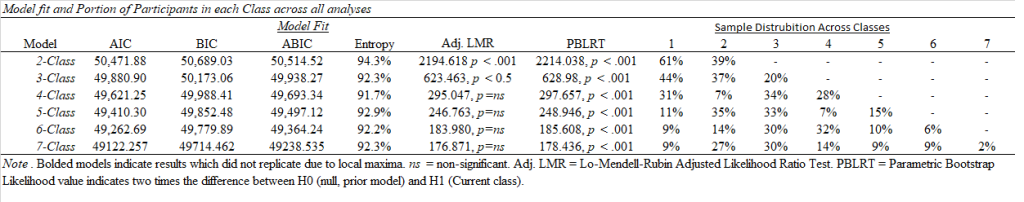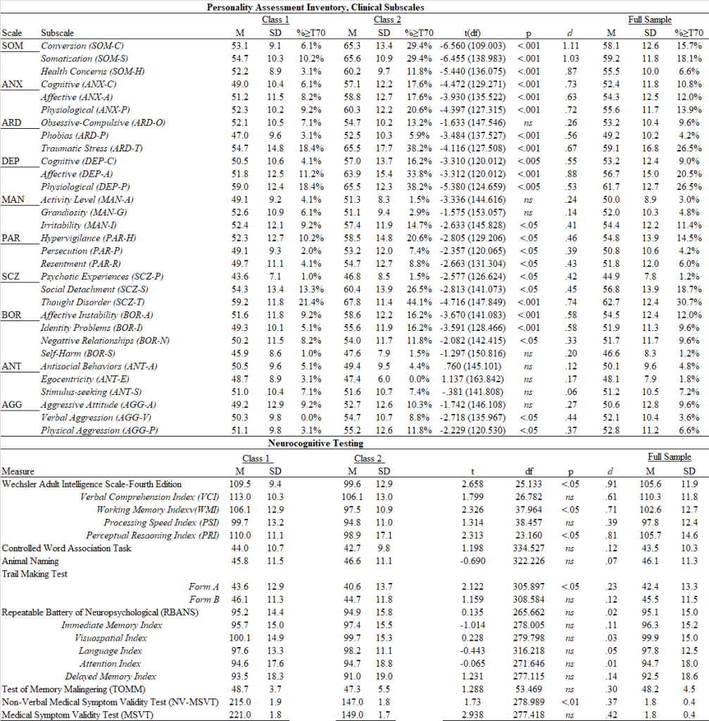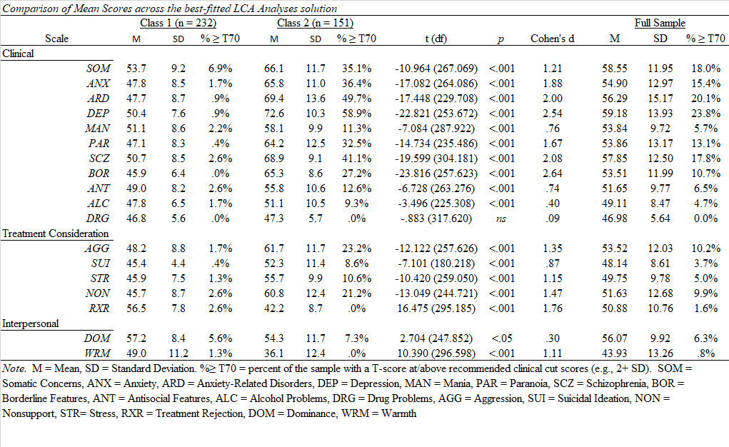 LPA were conducted using the Clinical, Treatment, and Interpersonal Scales because of their non-overlapping item content. The best-fitted model (based on AIC/BIC/SSA-BIC/Entropy & Parsimony/theory-based interpretation) was contrasted across PAI subscales, as well as neuropsychological testing, PVT, and demographic data. Results suggest a 2-class solution (non-symptomatic [59%] and high symptomatic [40%]), with no differentiation between subsets of symptoms (e.g., manic, externalizing, or somatic, per earlier studies). Scale differences reflected generally large effects, particularly for SOM, ANX, ARD, DEP, PAR, SCZ, and BOR (d = 1.07 – 2.50). High symptom groups also evidenced poorer neurocognitive testing and more frequent PVT failure. These findings suggest that previously identified response groups are not evident in active-duty military with a remote history of brain injury. Some tables below to show off some of the results of the poster (Click to download).