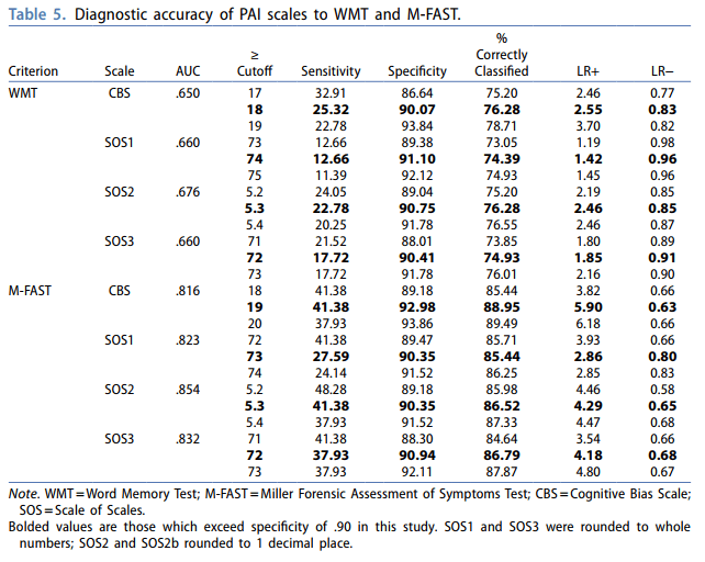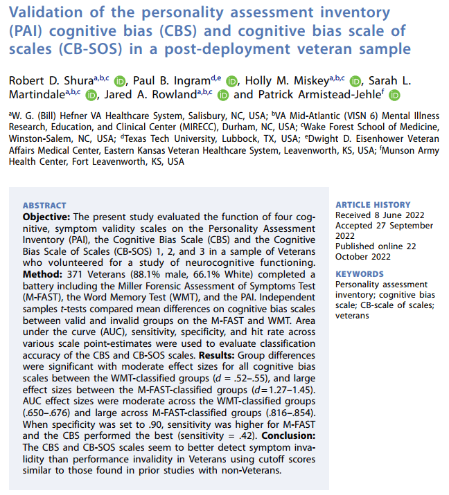 Recently, a collaboration with the wonderful folks at the Salisbury Veteran Affairs MIRECC was published in The Clinical Neuropsychologist. In this article we examined the CBS and CB-SOS scales for the PAI to determine their detection of over-reported cognitive symptoms (Word Memory Test Criterion) and general psychopathology over-reporting (M-Fast Criterion) in a sample of post-deployment Veterans. This is an exciting article that continues to grow validity detection effectiveness and options on the PAI and the article also highlights some very important considerations for traditional conceptualizations of distinct over-reporting strategies (e.g., cognitive, somatic, and psychological distress patterns; Sweet et al., 2021).