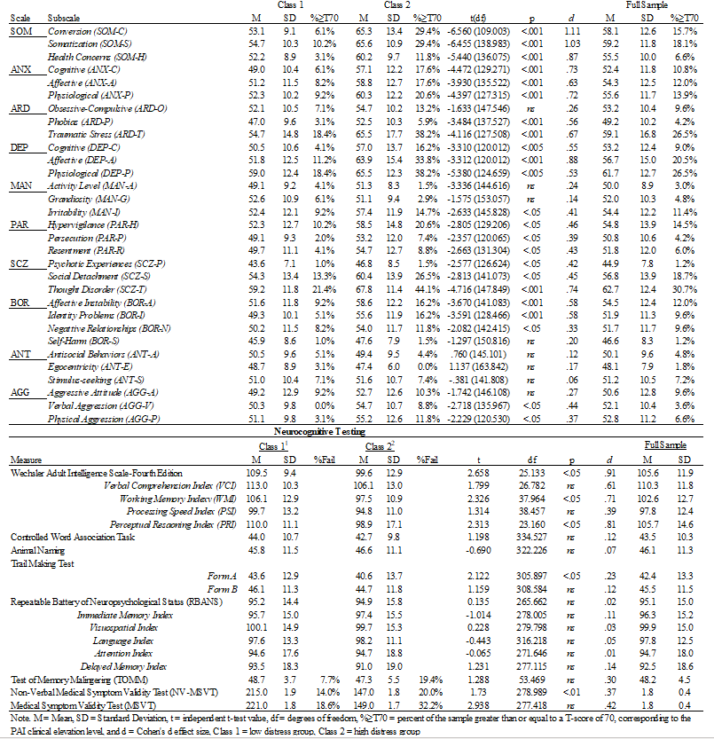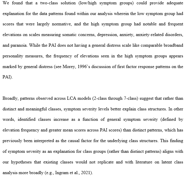 The findings here have a few distinct implications: (1) prior group identification efforts are not replicated in AD personnel and may, instead, represent broader issues with analysis discussed above rather than meaningful findings, (2) the first factor problem (general elevation of substantive clinical scales due to distress, not specific pathology) may also play a role in the observed patterns and should be addressed to aid in the future of the PAI (see Morey, 1996 for discussion of the first factor problem).