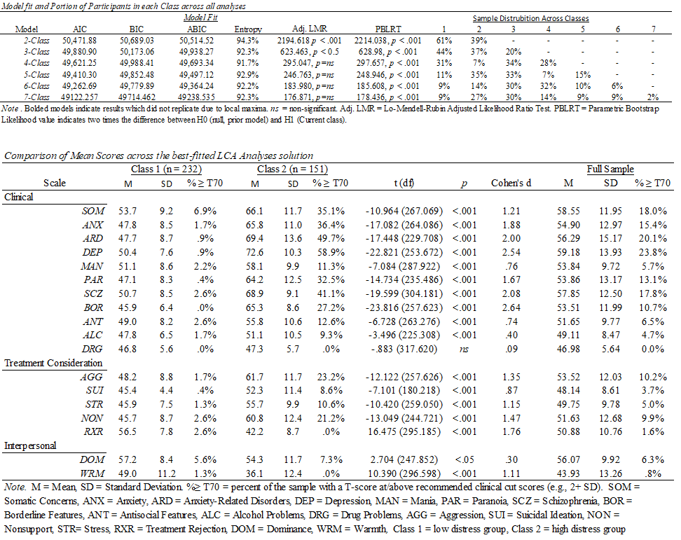 Taking these challenges into account, as well as the unique need to focus on military populations who face higher head injury rates than others, our recent paper used latent profile analysis (LPA) to explore potential groups of mTBI diagnosed respondents on the Personality Assessment Inventory (PAI). Although prior and related mTBI work (see above) had identified a variety of cluster solutions (2-4 classes), we hypothesized that we would not find meaningful classes. Rather, class extraction would represent a continuous underlying pattern of symptom severity – not functionally distinct groups. We grounded this finding in some prior work we conducted on PTSD groups in the PAI (see Ingram et al., 2022; Click for PDF) as well as the first- factor problem of the PAI.
