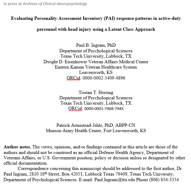 Previous work has examined PAI response patterns on those with mild traumatic brain injury (mTBI), but these research efforts have faced a number of notable challenges. Accordingly, findings between studies have often contradicted. There are a variety of reasons for these contradictions including, but not limited to, that prior research has: (1) not excluded individuals from analysis with failed validity testing, meaning that data analyzed is likely not fully valid/reliable, (2) the inappropriate use of item-level grouping analyses (factor analysis) to identify groups of participants, which is better suited to cluster/profile analysis, (3) insufficient sample sizes to conduct any of the analyses undertaken (i.e., far fewer participants per observed variable analyzed than required; see Brown, 2015), (4) interpretation of scale means that are entirely normative (i.e., T-score mean of 50, corresponding to the normative sample’s mean) as indicating a clinical pattern, and (5) use of analyses without fit statistics, making comparison between identified cluster solutions tentative at best. We aimed to address these limitations through our study, now in press at Archives in Clinical Neuropsychology. CLICK ME TO DOWNLOAD A PREPRINT.