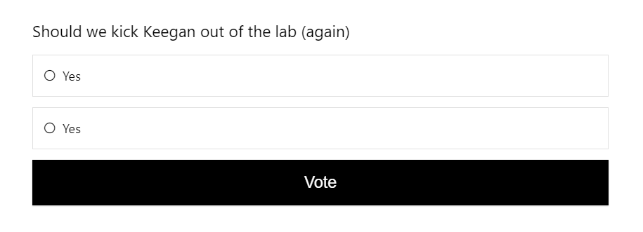 On an entirely related note, Keegan is kicked out of the lab again. Sarah also proposed that he be kicked out a second, simultaneous time for thinking he might not have be kicked out. We’re holding a lab vote now to determine if he should be kicked out, perhaps a third time today (vote below). I am yet to confirm which way Keegan voted.