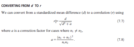If you compare F’s effectiveness across Medical, Cognitive, and Medical, it’s clear that the effect size is largest in one domain (Psych, 1.12) over the others (.75 and .67). There isn’t a statistical test to evaluate the difference (Fischer r to z/Cohen’s Q), but it eyeballs to look fine (quick reminder of why Cohen’s Q works due to d:r equality below).