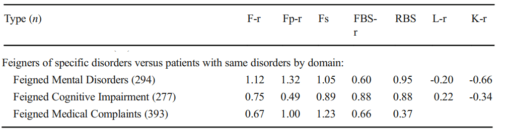 Those patterns don’t look to support the whole three domain focus on feigning. In fact, it aligns more with recent work on general feigning approaches (Gaines et al., 2013; Keen et al., 2022) that highlight the lack of sophistication in symptom experience misrepresentation (see Morris et al., 2021 for an evaluation of effects across feigning conditions).