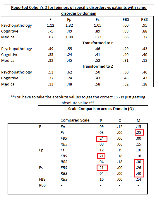 When I use the word “better”, I mean a moderate effect size difference (e.g., d/g >= .5). This is the standard guidance for a ‘significant’ difference of clinical impact (see Cohen, 1988; Rosnow et al., 2000) and is the common metric for personality assessment research on criterion effectiveness. I’ve re-created the data above after computing Cohen’s Q statistics. Cohen’s Q works because of the equality of r/z/d/etc and allows a procedure useful in comparing effects across groups. Recent work in personality assessment has started to use Cohen’s Q to evaluate these differences (e.g., Morris et al., 2023), including beyond work being done within the PATS lab. Some quick transformations in the top table, and Q values in the one below.