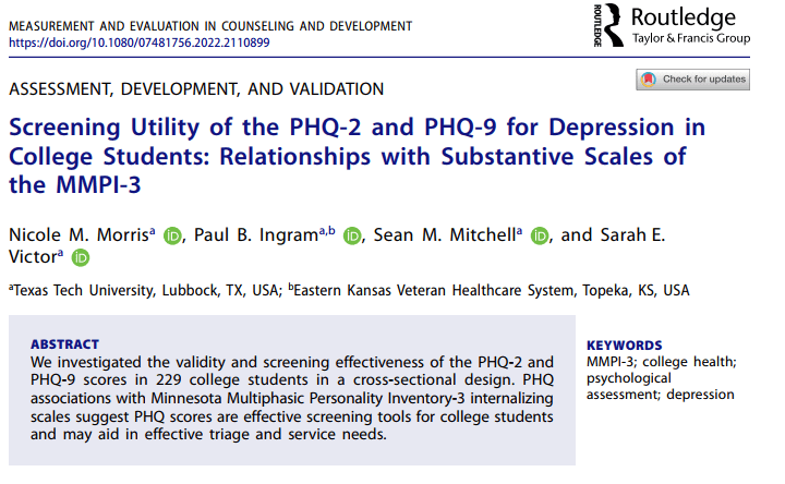 Cole, B.P., & Ingram, P.B. (2022, June). Treatment prediction in an outpatient telehealth clinic: Relationships between MMPI-3 scores and positive-psychology intervention engagement and outcome. Data blitz presented at the 2022 Annual MMPI Research Symposium, Minneapolis, MN.